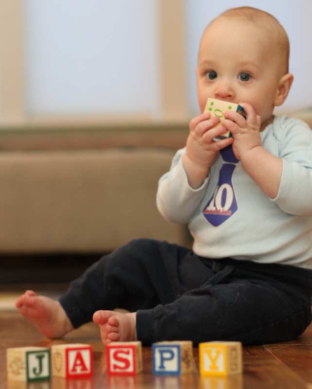 Wow Jasper, it’s time to celebrate 10 months of living. You are now crawling with ease (but sometimes you regress to scooting and army crawling because you are much faster that way) and moving all around the house. The tupperware drawer is a favorite of yours’ and you do a great job of emptying the bottom drawer and playing with your bowls, spoons, and food containers; it’s also a great way to keep you entertained as mama & papa can empty the dishwasher or do other chores in the Kitchen.